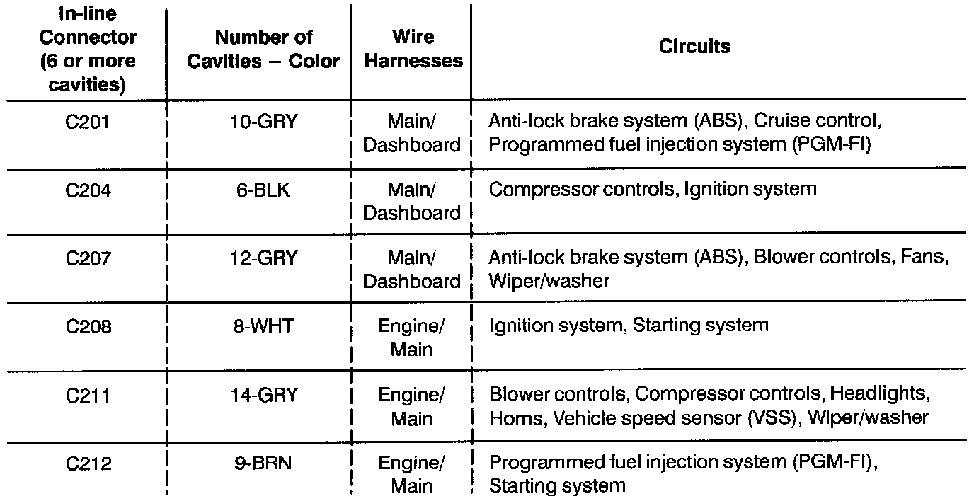 Example: The horn, A/C, and the right headlight don't work. List all in-line-connectors in the horn circuit and check this chart. You find that C211 is common to the A/C circuit and the headlight circuit, so you inspect C211 and find the problem: bent terminals.