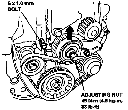 10. Lock the timing belt adjuster arm in place by installing one of the 6 x 1.0 mm bolts.