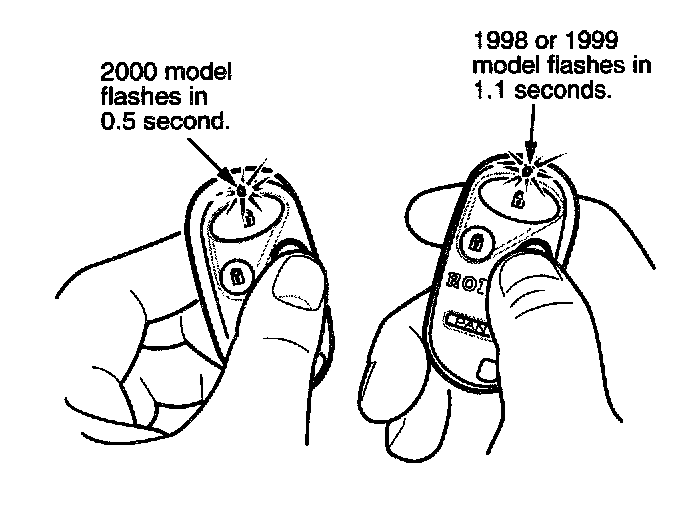 3. To determine if the non-working remote transmitter is for a 2000 Accord, hold a known good 2000 model remote transmitter and the transmitter in question side by side. Press the trunk release button on each transmitter at the same time. The LED on the 2000 model remote transmitter will flash in 0.5 second. A 1998-99 model will flash in 1.1 seconds.