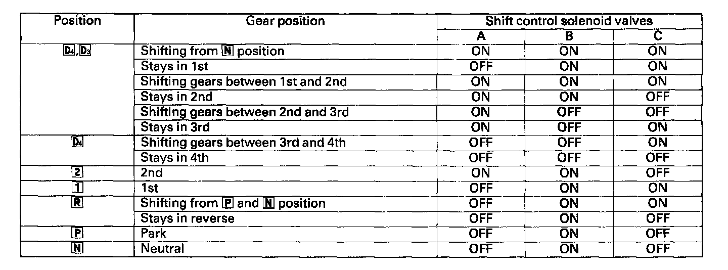 The combination of driving signals to shift control solenoid valves A, B, and C is shown in the table above.