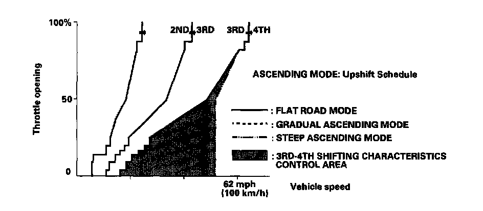 When the PCM determines that the vehicle is climbing a hill in [D4] and [D3] positions, the system extends the engagement area of 2nd gear and 3rd gear to prevent the transmission from frequently shifting between 2nd and 3rd gears, and between 3rd and 4th gears, so the vehicle can run smooth and have more power when needed.