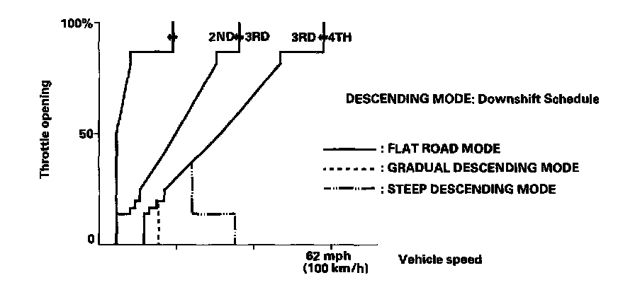 When the PCM determines that the vehicle is going down a hill in [D4] and [D3] positions, the shift-up speed from 3rd to 4th gear and from 2nd to 3rd (when the throttle is closed) becomes faster than the set speed for flat road driving to widen the 3rd gear and 2nd gear driving areas. This, in combination with engine braking from the deceleration lock-up, achieves smooth driving when the vehicle is descending. There are two descending modes with different 3rd gear driving areas and 2nd gear driving areas according to the magnitude of a gradient stored in the PCM. When the vehicle is in 4th gear, and you are decelerating when you are applying the brakes on a steep hill, the transmission will downshift to 3rd gear. When you accelerate, the transmission will then return to higher gear.
