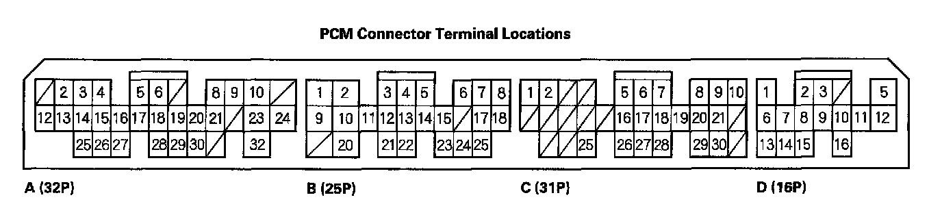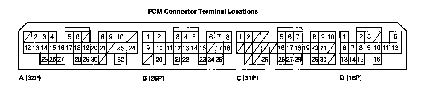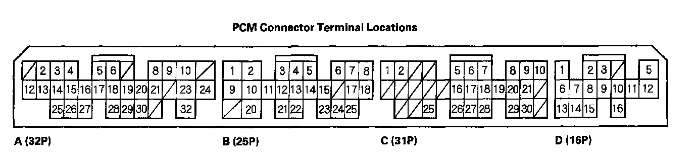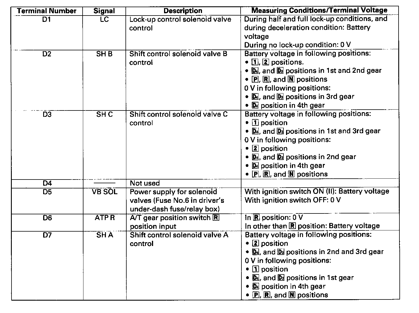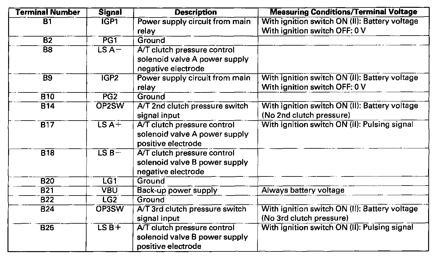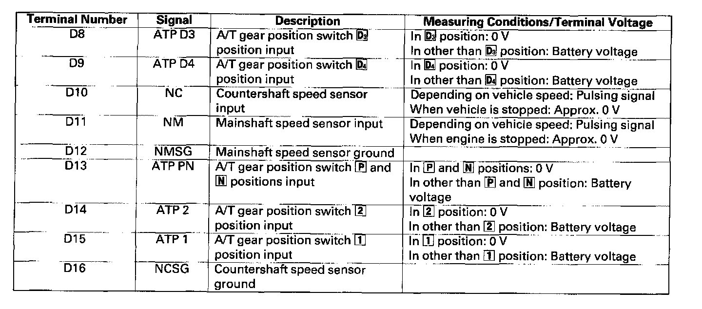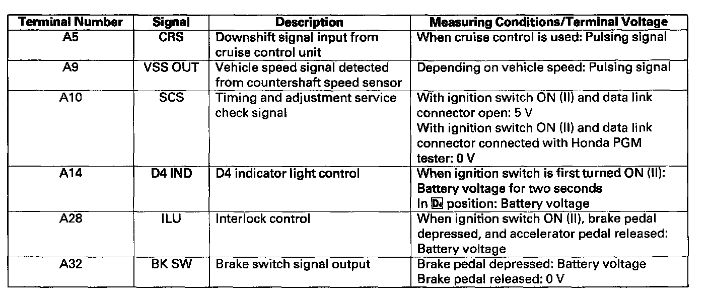 The PCM terminal voltage and measuring conditions are shown for the connector terminals that are related to the A/T control system. The other PCM terminal voltage and measuring conditions are found under Computers and Control Systems.