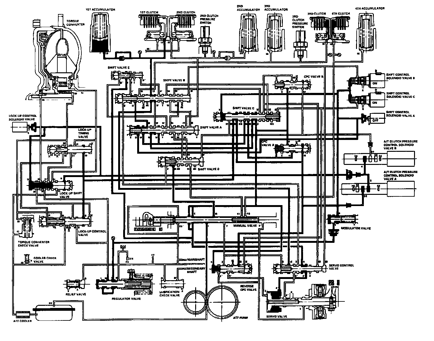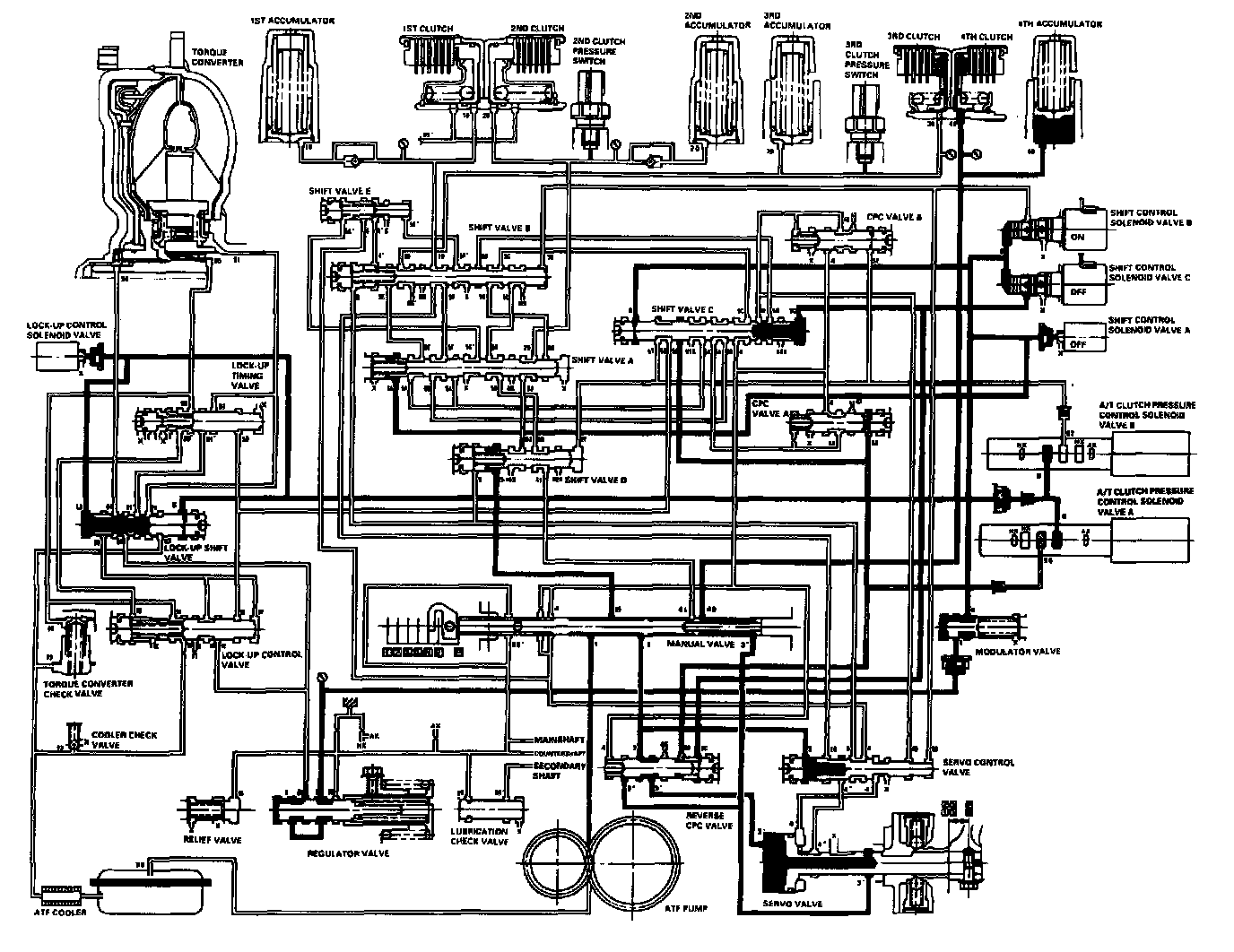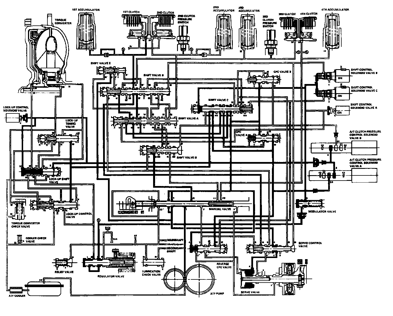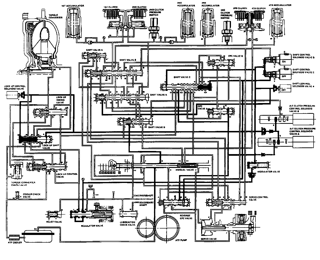 The PCM controls the shift control solenoid valves ON and OFF, and the shift control solenoid valves control shift solenoid pressure to the shift valves. Applying shift control solenoid pressure to the shift valves moves the position of the shift valve, and switches the port of hydraulic pressure. The PCM also controls A/T clutch pressure control solenoid valves A and B. The A/T clutch pressure control solenoid valves regulated the A/T clutch pressure control solenoid pressure and apply the A/T clutch pressure control solenoid pressure to CPC valves A and B.