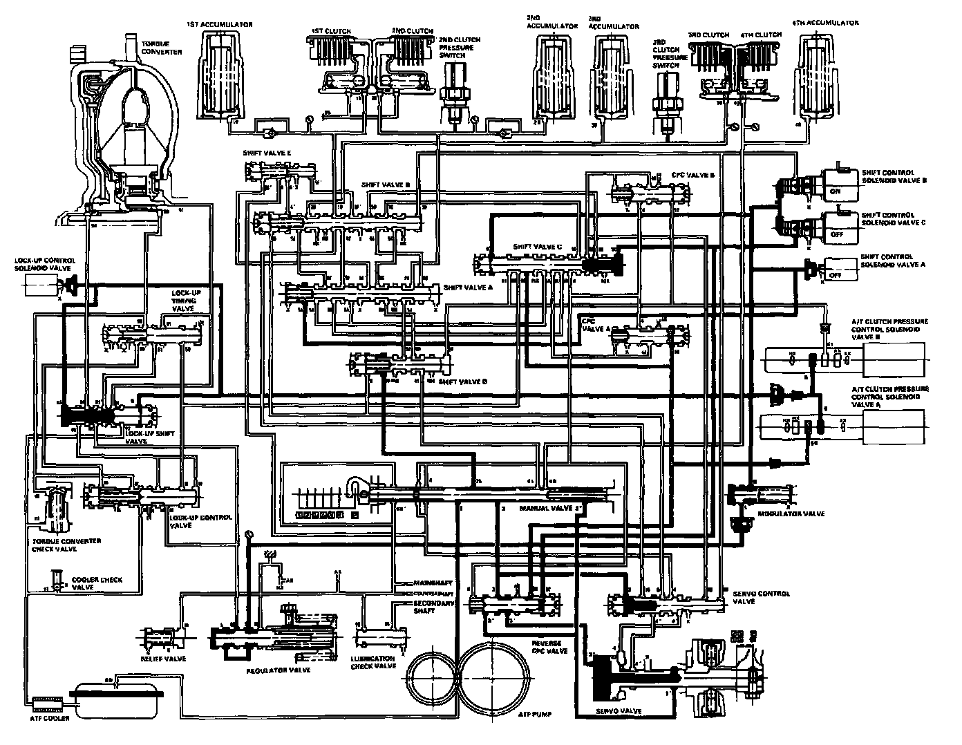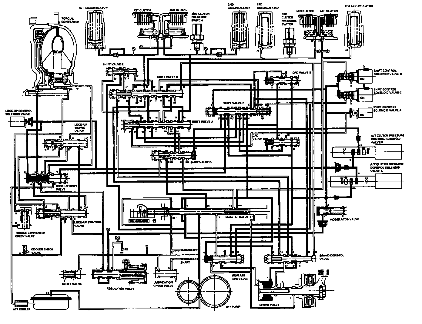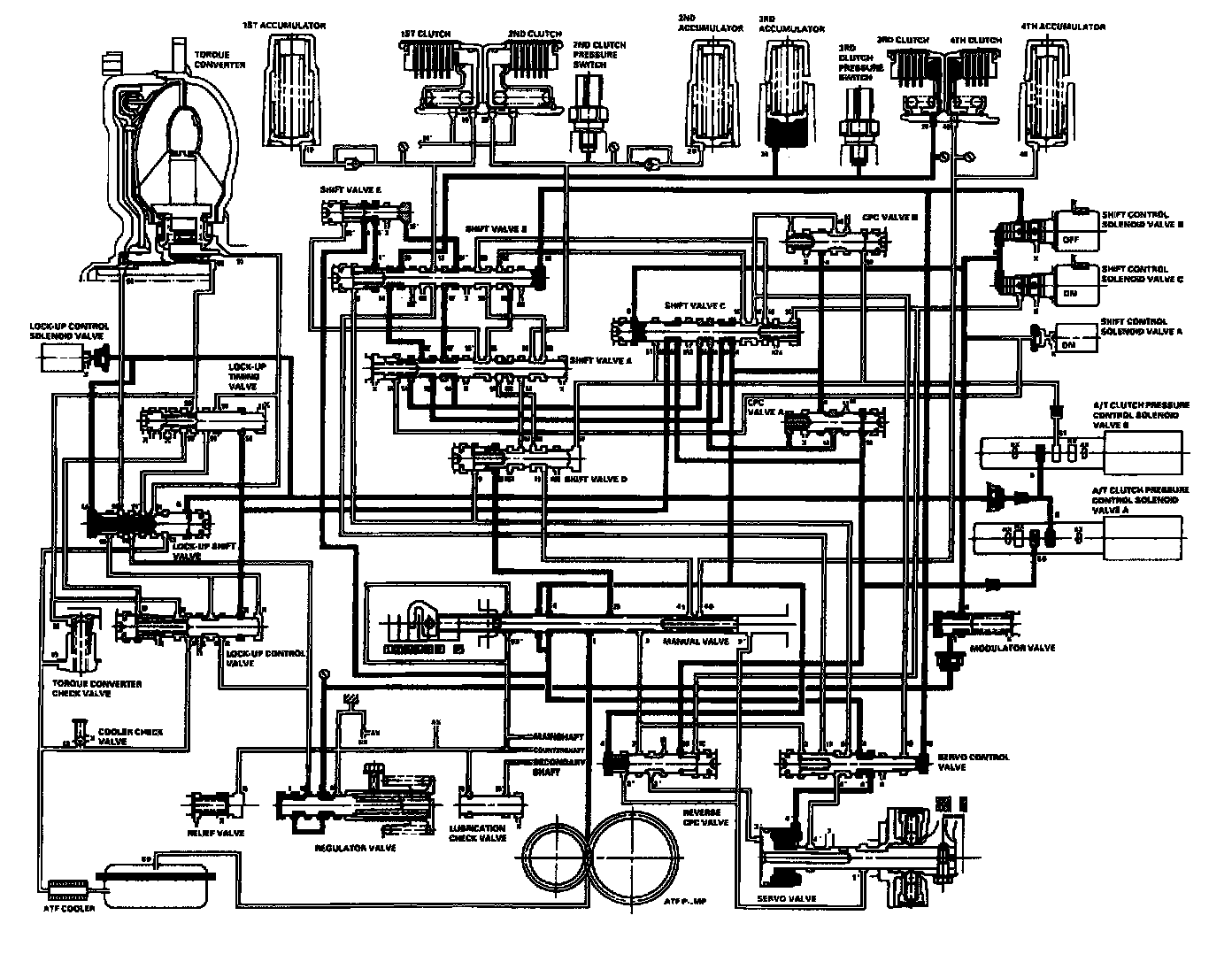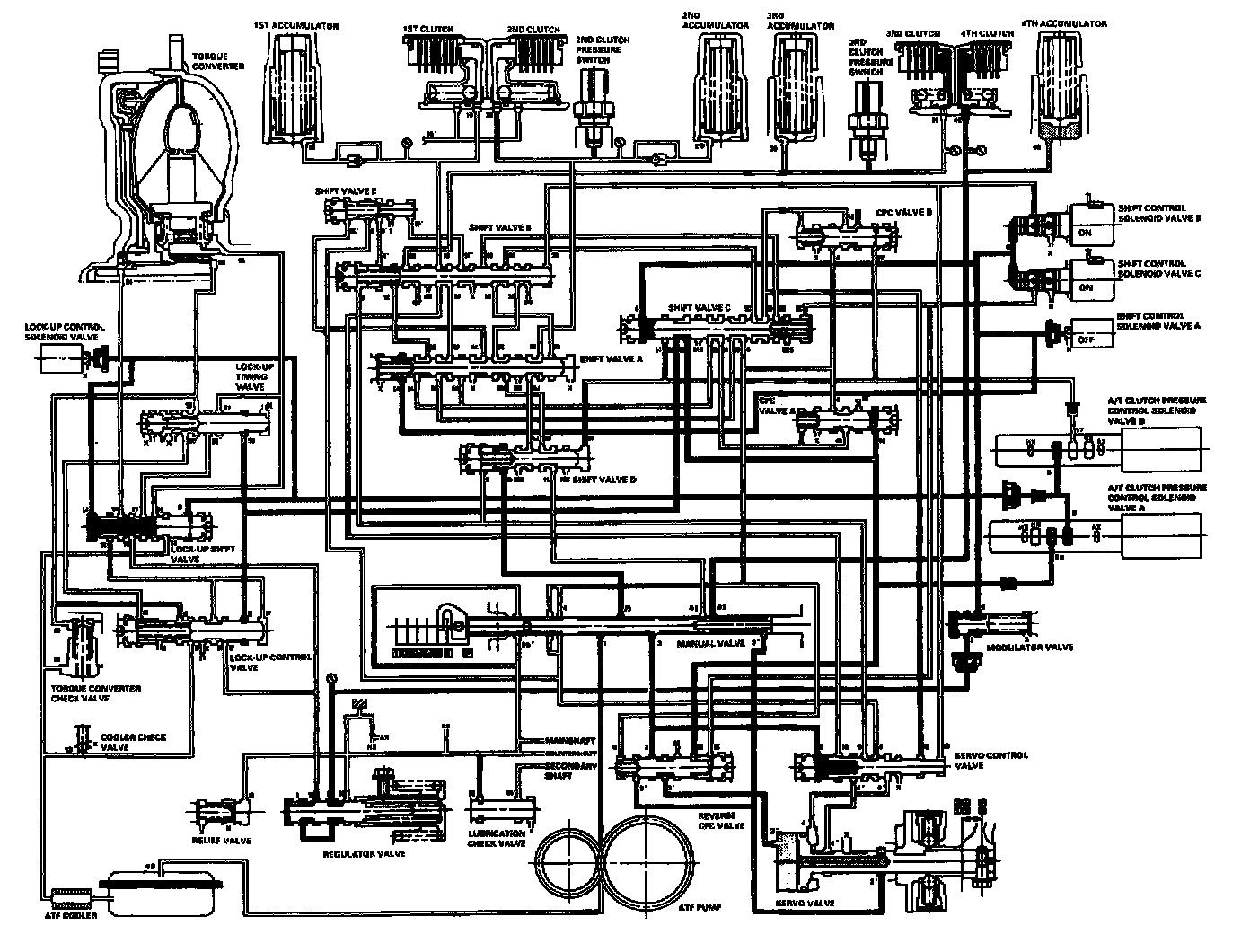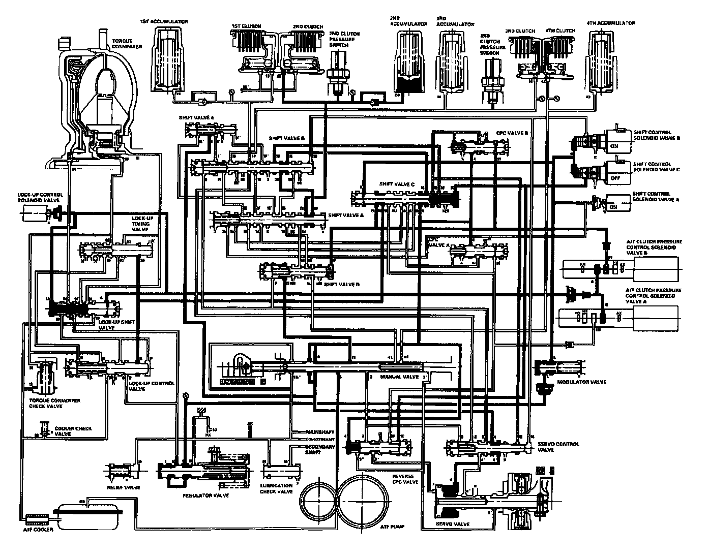 The PCM controls the shift control solenoid valves ON and OFF, and the shift control solenoid valves control shift solenoid pressure to the shift valves. Applying shift control solenoid pressure to the shift valves moves the position of the shift valve, and switches the port of hydraulic pressure. The PCM also controls A/T clutch pressure control solenoid valves A and B. The A/T clutch pressure control solenoid valves regulated the A/T clutch pressure control solenoid pressure and apply the A/T clutch pressure control solenoid pressure to CPC valves A and B.