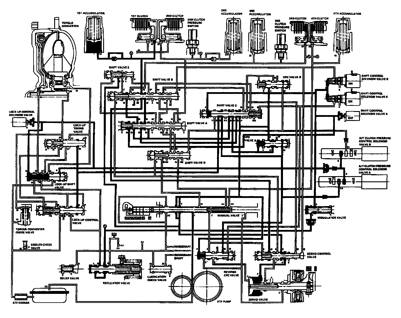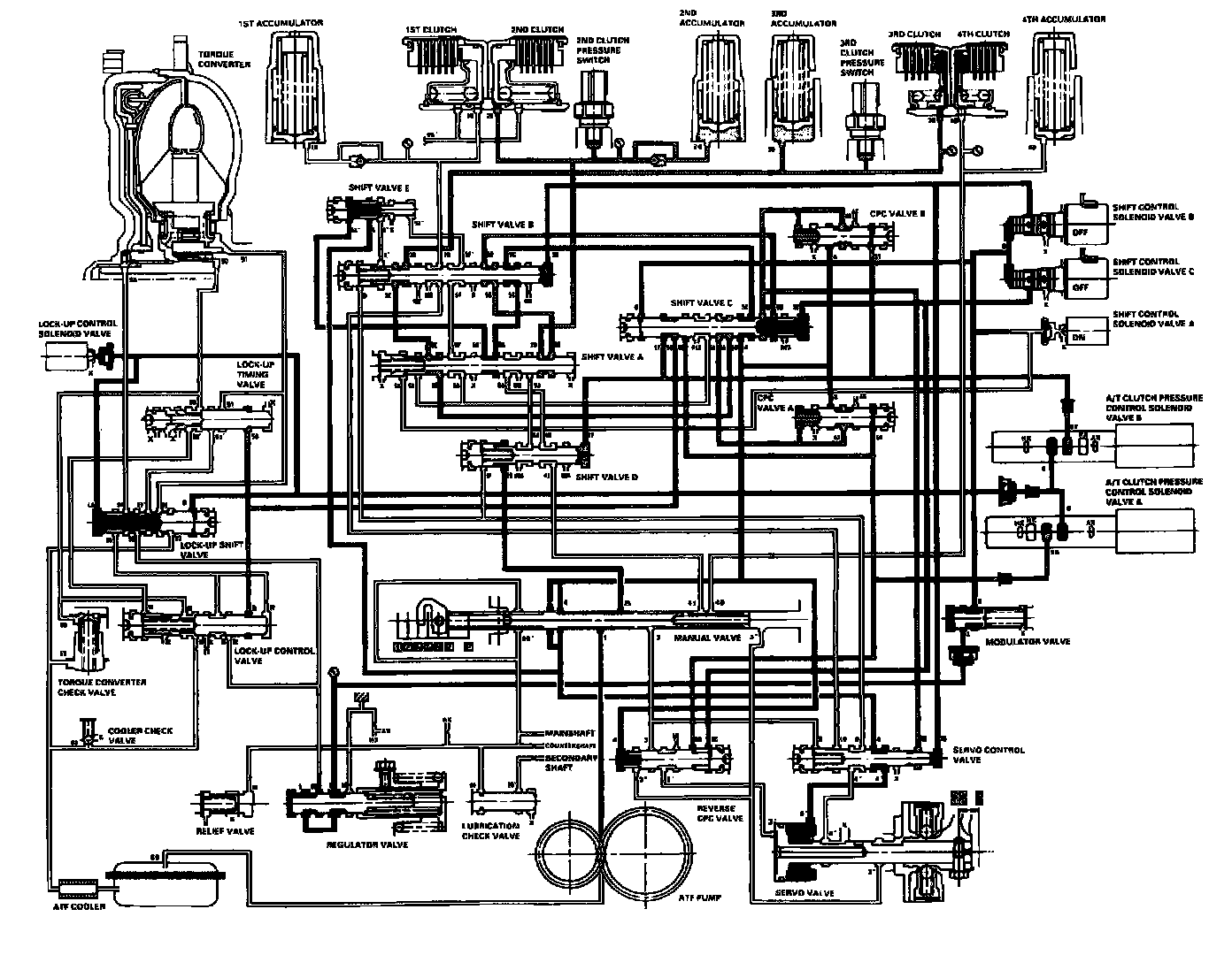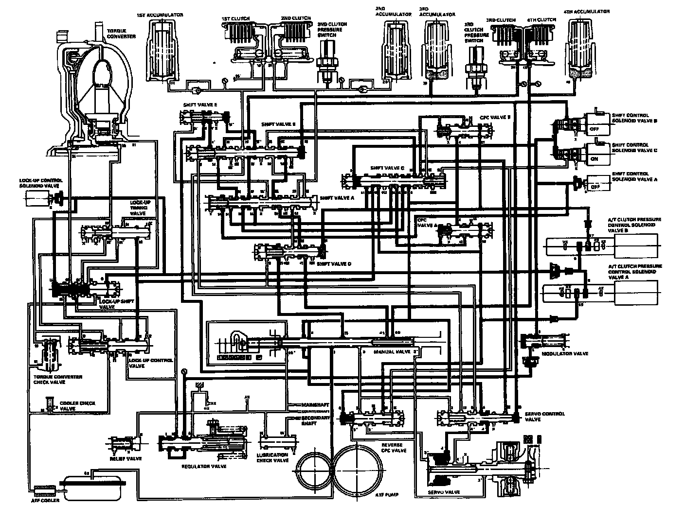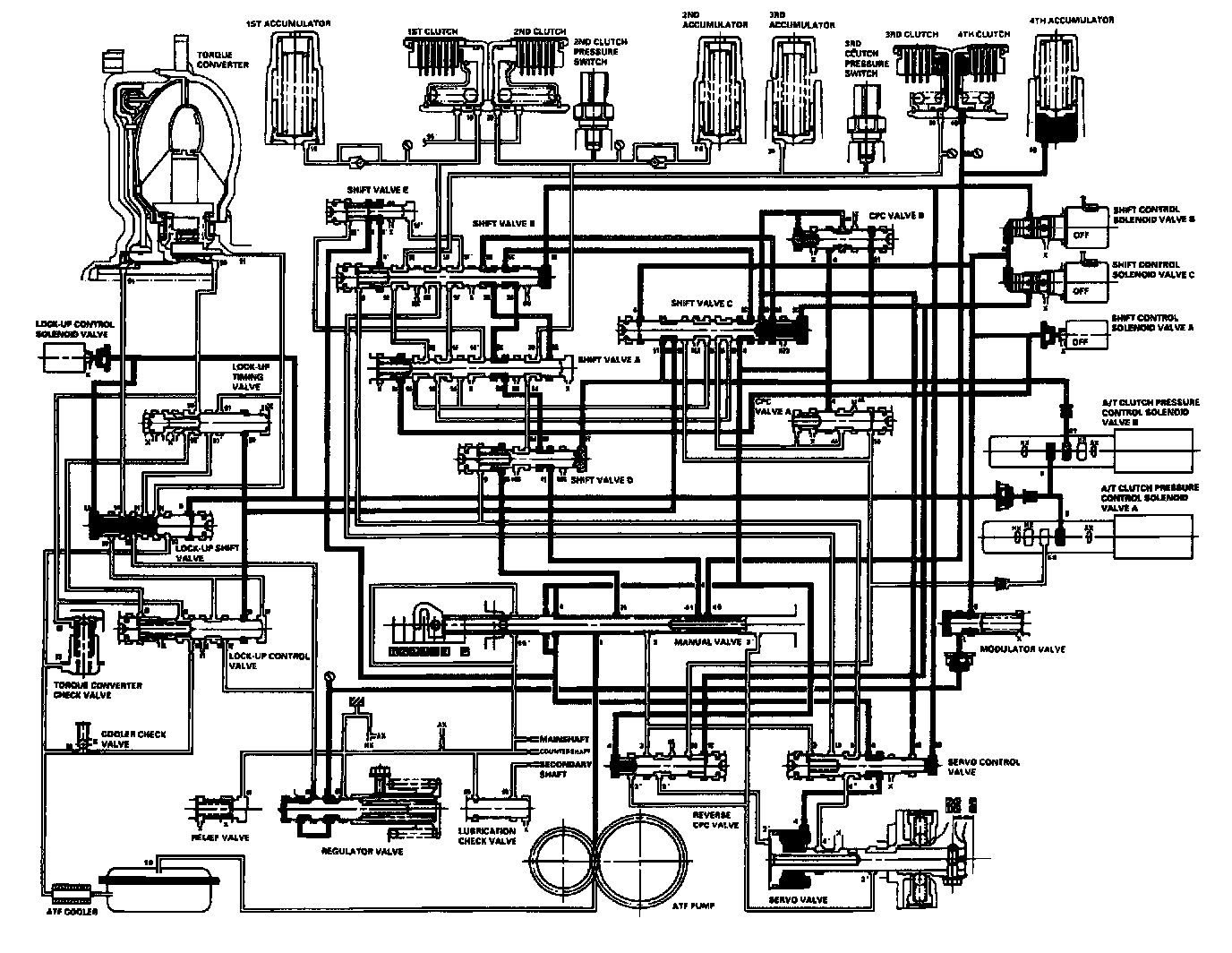 The PCM controls the shift control solenoid valves ON and OFF, and the shift control solenoid valves control shift solenoid pressure to the shift valves. Applying shift control solenoid pressure to the shift valves moves the position of the shift valve, and switches the port of hydraulic pressure. The PCM also controls A/T clutch pressure control solenoid valves A and B. The A/T clutch pressure control solenoid valves regulated the A/T clutch pressure control solenoid pressure and apply the A/T clutch pressure control solenoid pressure to CPC valves A and B.