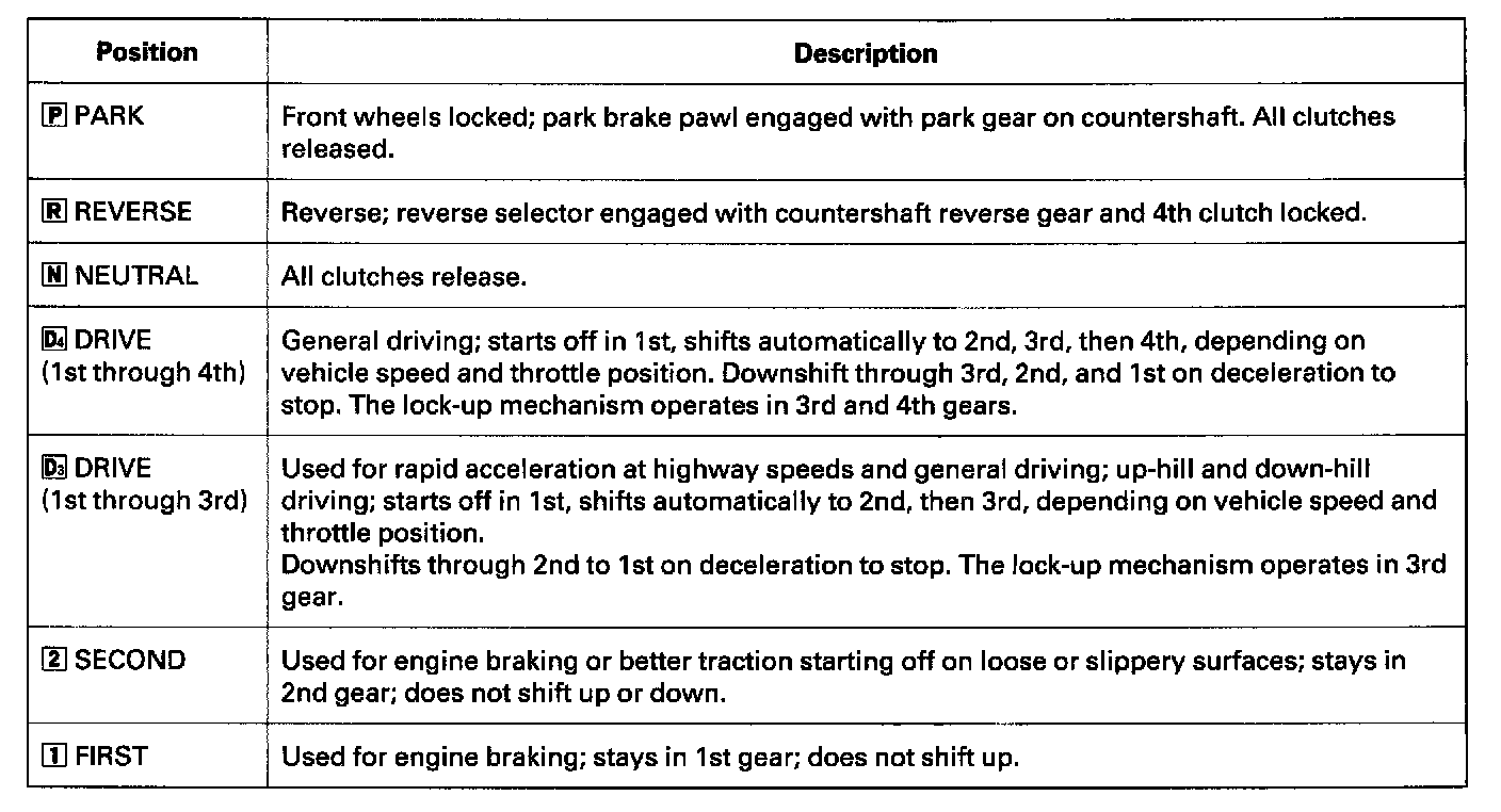 The shift lever has seven positions: [P] PARK, [R] REVERSE, [N] NEUTRAL, [D4] 1st through 4th gear ranges, [D3] 1st through 3rd gear ranges, [2] 2nd gear, and [1] 1st gear.