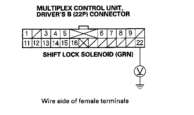 6. Measure the voltage between the B22 terminal of the multiplex control unit, driver's B (22P) connector and body ground.