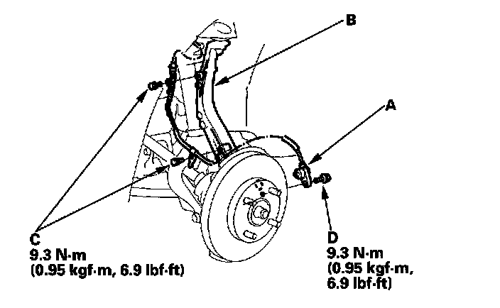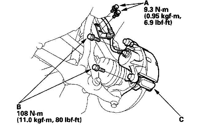 6. Remove the caliper mounting bolts (B), and hang the caliper assembly (C) to one side. To prevent damage to the caliper assembly or brake hose, use a short piece of wire to hang the caliper from the undercarriage.