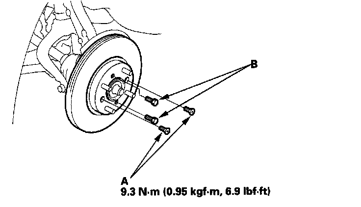 9. Screw two 8 x 1.25 mm bolts (B) into the disc to push it away from the hub. Turn each bolt two turns at a time to prevent cocking the disc excessively.