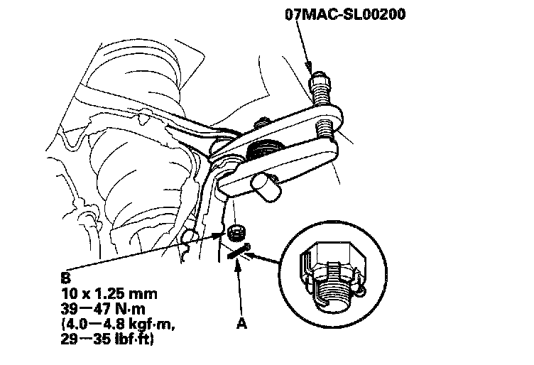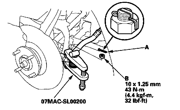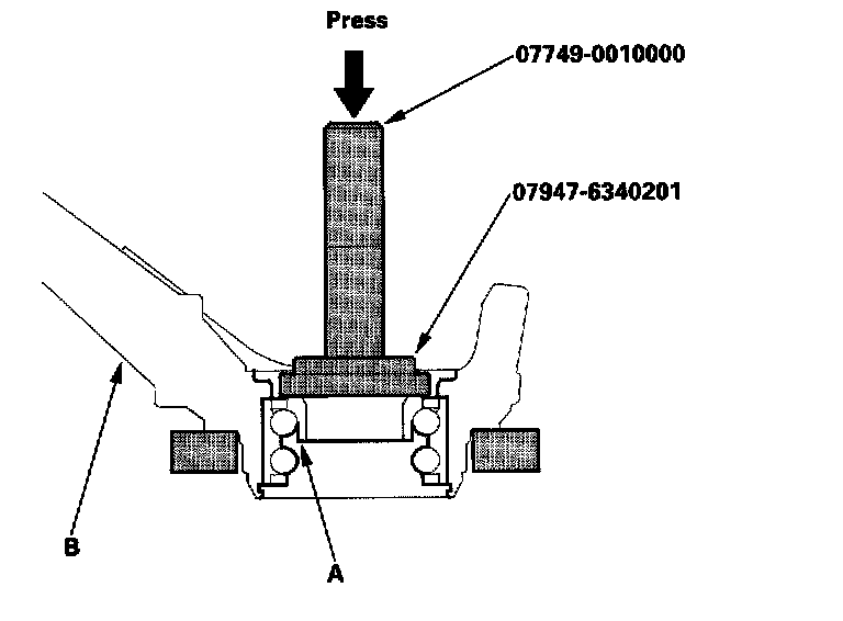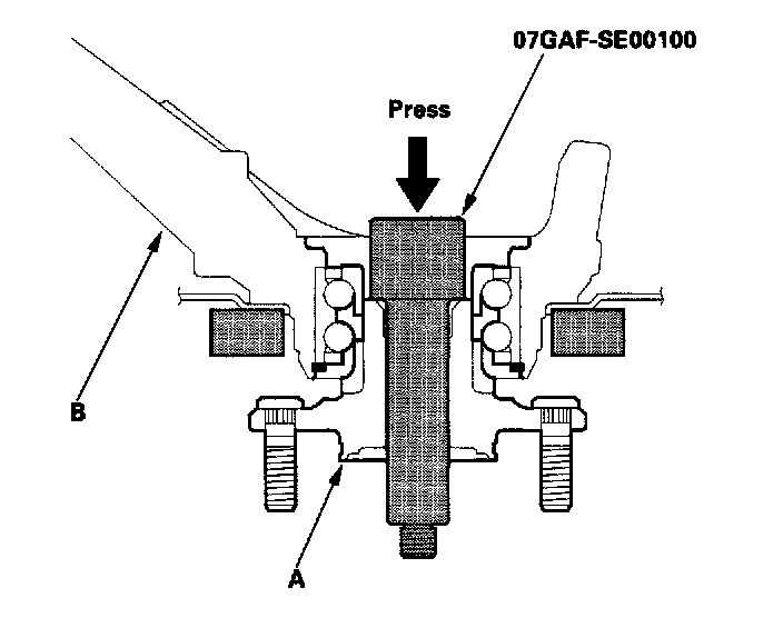 19. Separate the hub (A) from the knuckle (B) using the special tool, and a hydraulic press. Take care not to distort the splash guard. Hold onto the hub to keep it from falling when pressed clear.