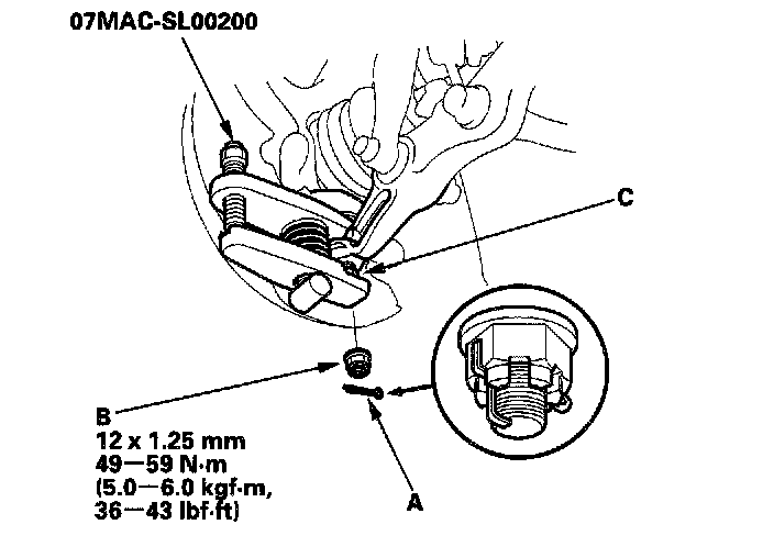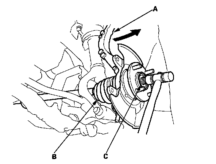 18. Pull the knuckle outward, and remove the driveshaft outboard joint (B) from the knuckle (A) by tapping the driveshaft end (C) with a plastic hammer, then remove the knuckle.