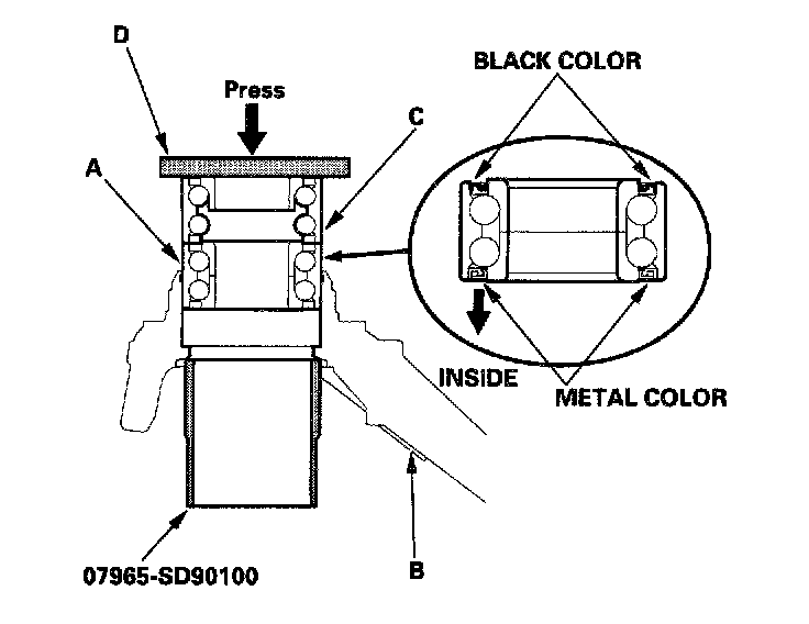 24. Press a new wheel bearing (A) into the knuckle (B) using the old bearing (C), a steel plate (D), the special tool, and a press. Place the wheel bearing on the knuckle with the pack seal side facing (metal color) toward the inside. Be careful not to damage the sleeve of the pack seal.