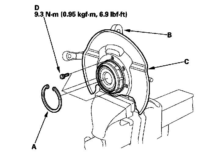 20. Remove the snap ring (A) and the splash guard (B) from the knuckle (C).