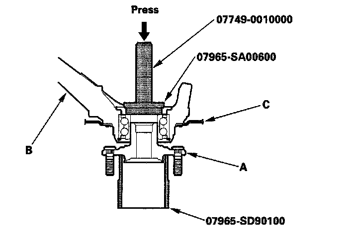 22. Press the wheel bearing inner race (A) from the hub (B) using the special tool, a commercially available bearing separator (C), and a press.