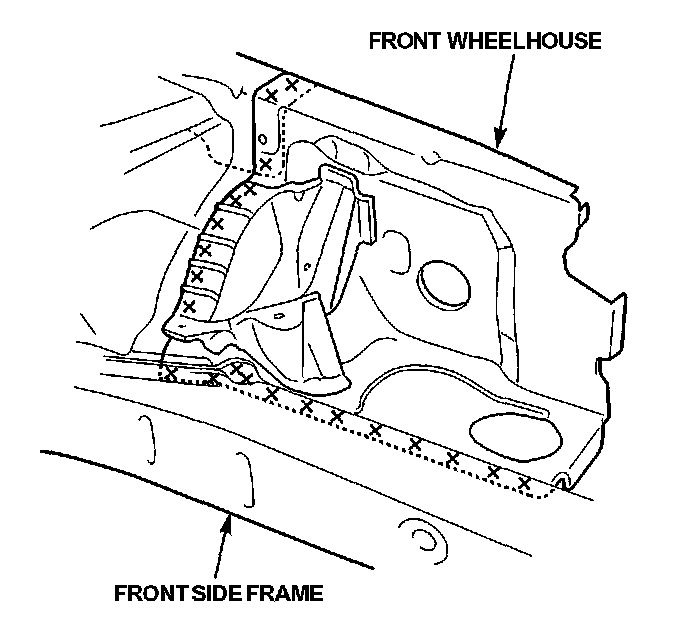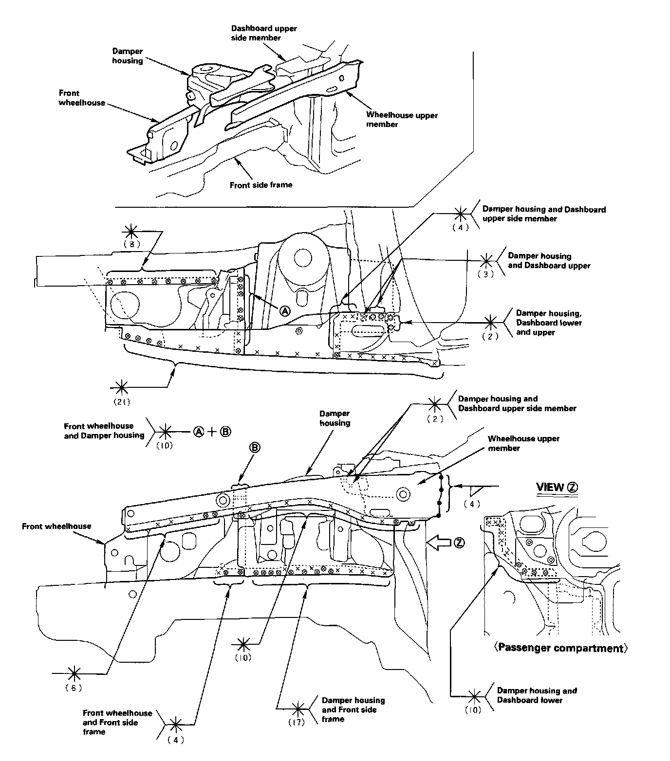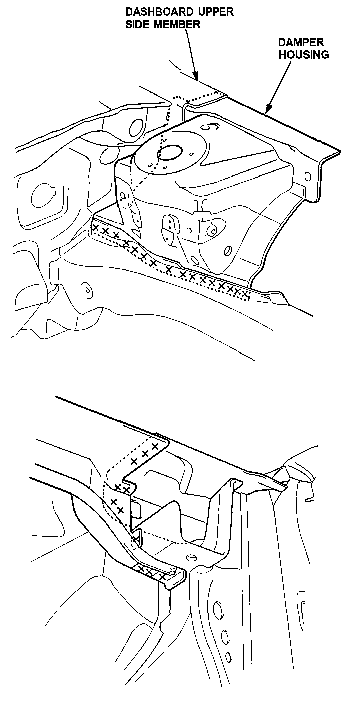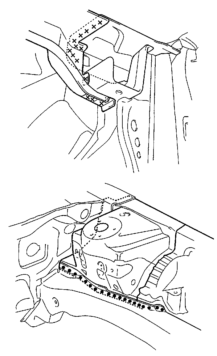 Mass Production Body Welding DiagramThe front wheelhouse component is constructed as a unit with the front damper housing. Therefore, replacement of the component affects the front wheel alignment. When assembling it, either use a positioning jig or follow the dimensions on the frame repair chart for positioning. Weld carefully.