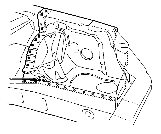 - From the passenger compartment side, drill holes in the spot welded area with a 5 mm (0.2 in) spot weld cutter.