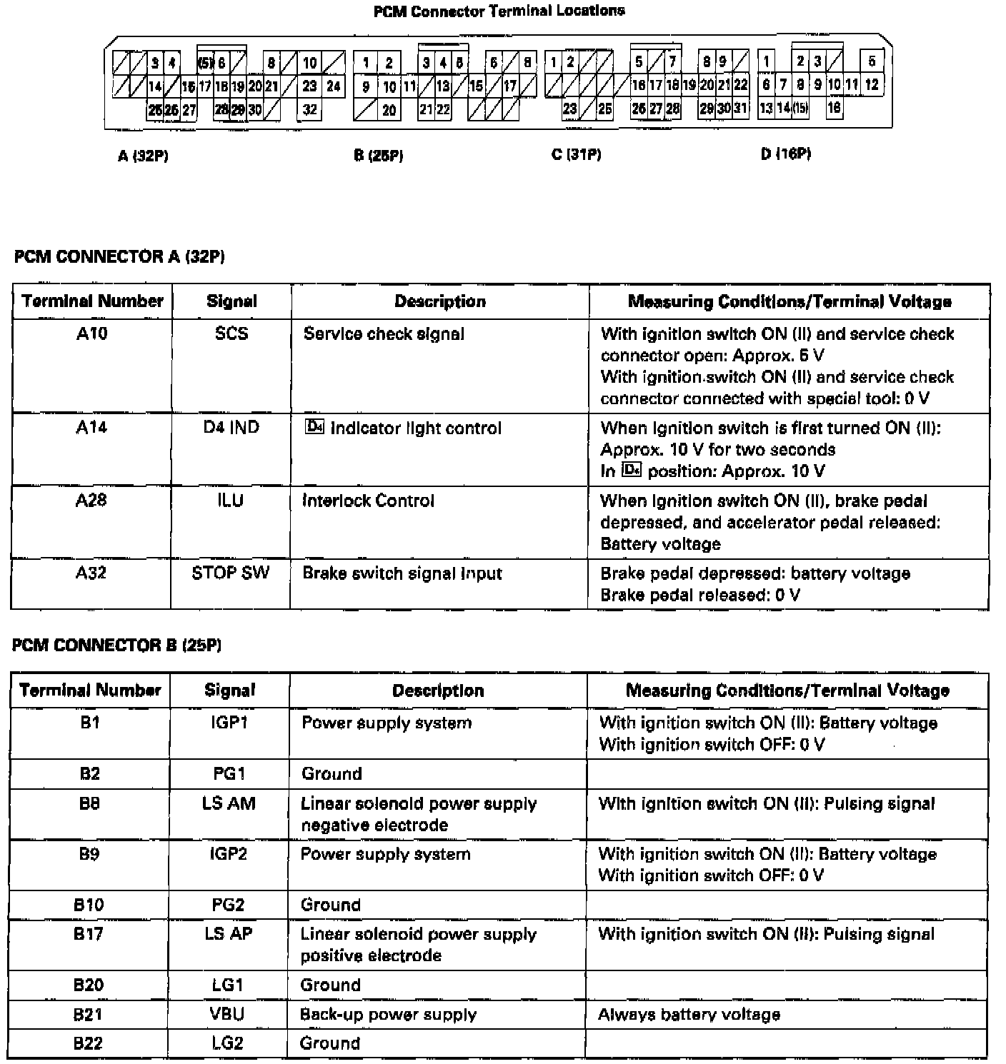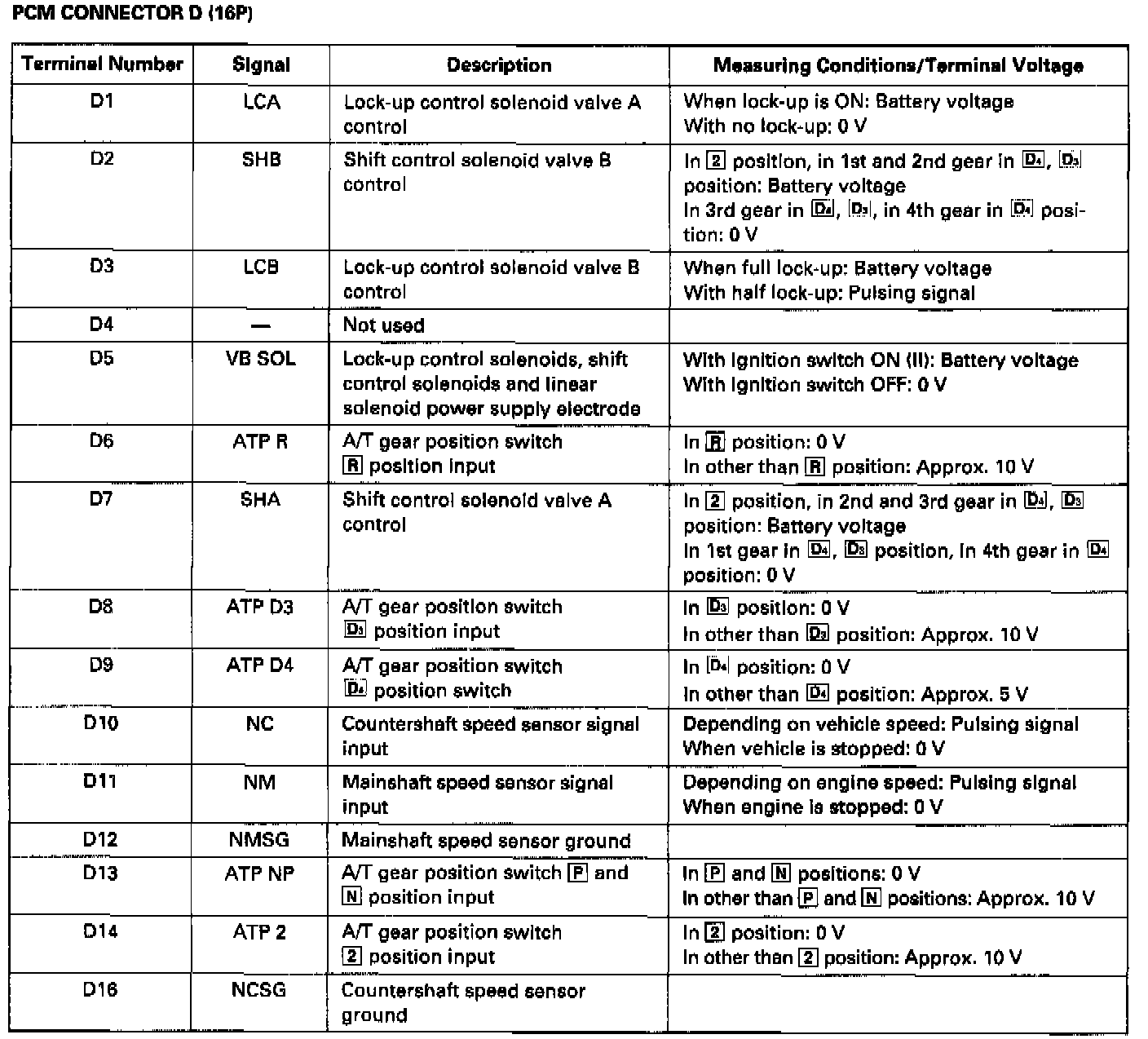 The PCM terminal voltage and measuring conditions are shown for connector terminals related to the A/T control system. The other PCM terminal voltage and measuring conditions are described in Computers and Control Systems.