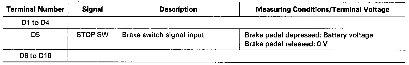 The PCM terminal voltage and measuring conditions are shown for the connector terminals that relate to the A/T control system. The other PCM terminal voltage and measuring conditions are described under Computers and Control Systems/Normal Scan Data Values. Testing and Inspection