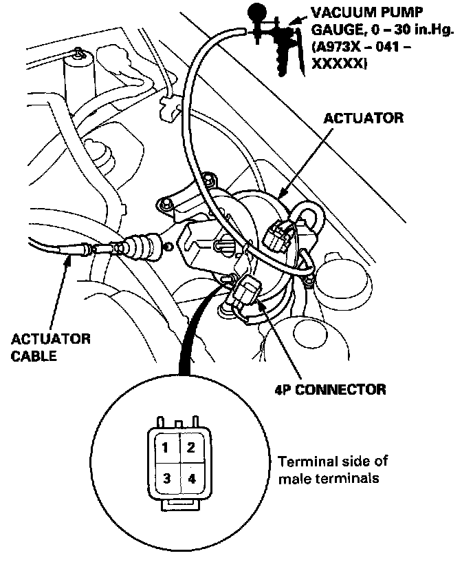 9. Disconnect power and ground from the 4P connector. Disconnect the vent hose from the actuator. Connect a vacuum pump to the actuator vent hose port, and apply vacuum. The actuator rod should pull in completely. If not, the vacuum valve is stuck open. Replace the actuator.