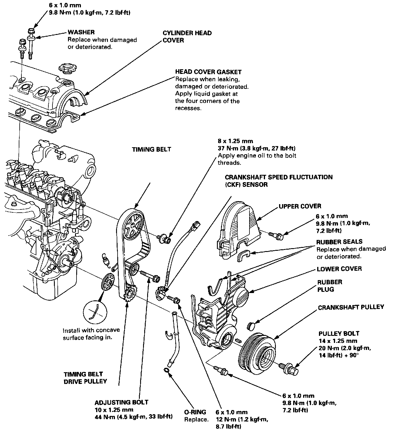 - Refer to replacement of Crankshaft Pulley and Pulley Bolt, before installing the timing belt.