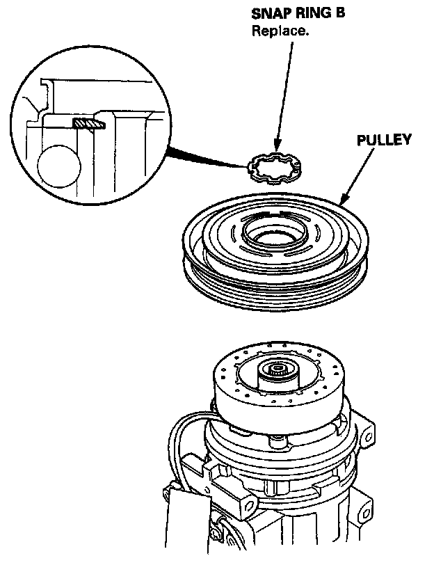 3. Remove the snap ring B with snap ring pliers, then remove the pulley. Be careful not to damage the pulley and compressor.