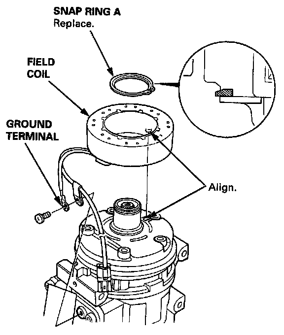 4. Remove the screw from the field coil ground terminal. Remove the snap ring A with snap ring pliers, then remove the field coil. Be careful not to damage the field coil and compressor.