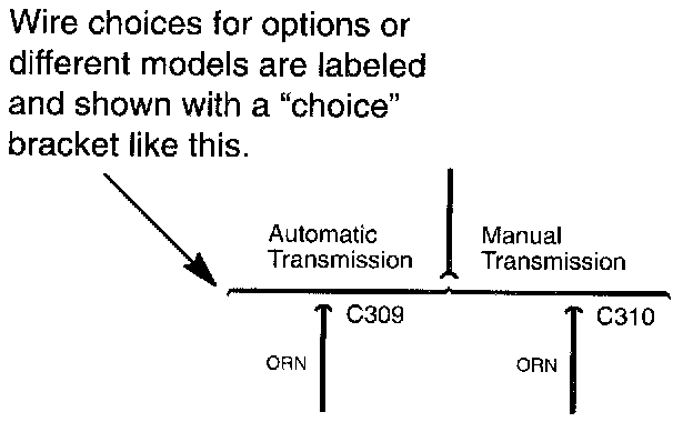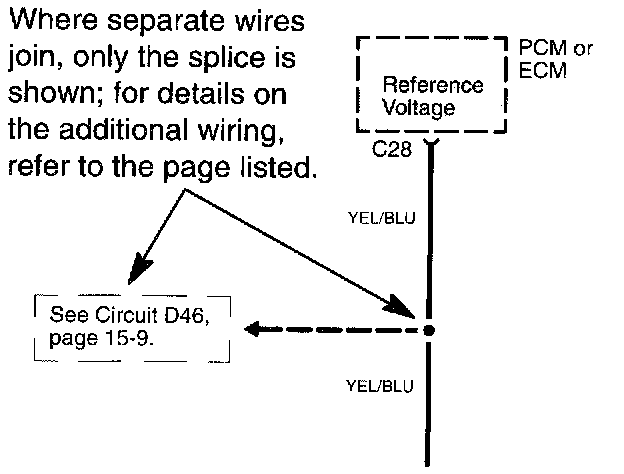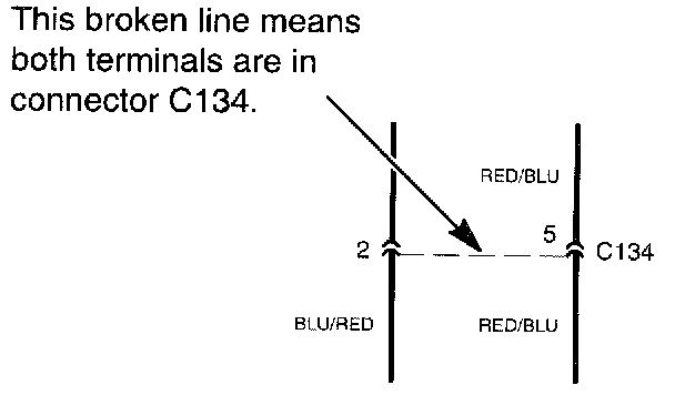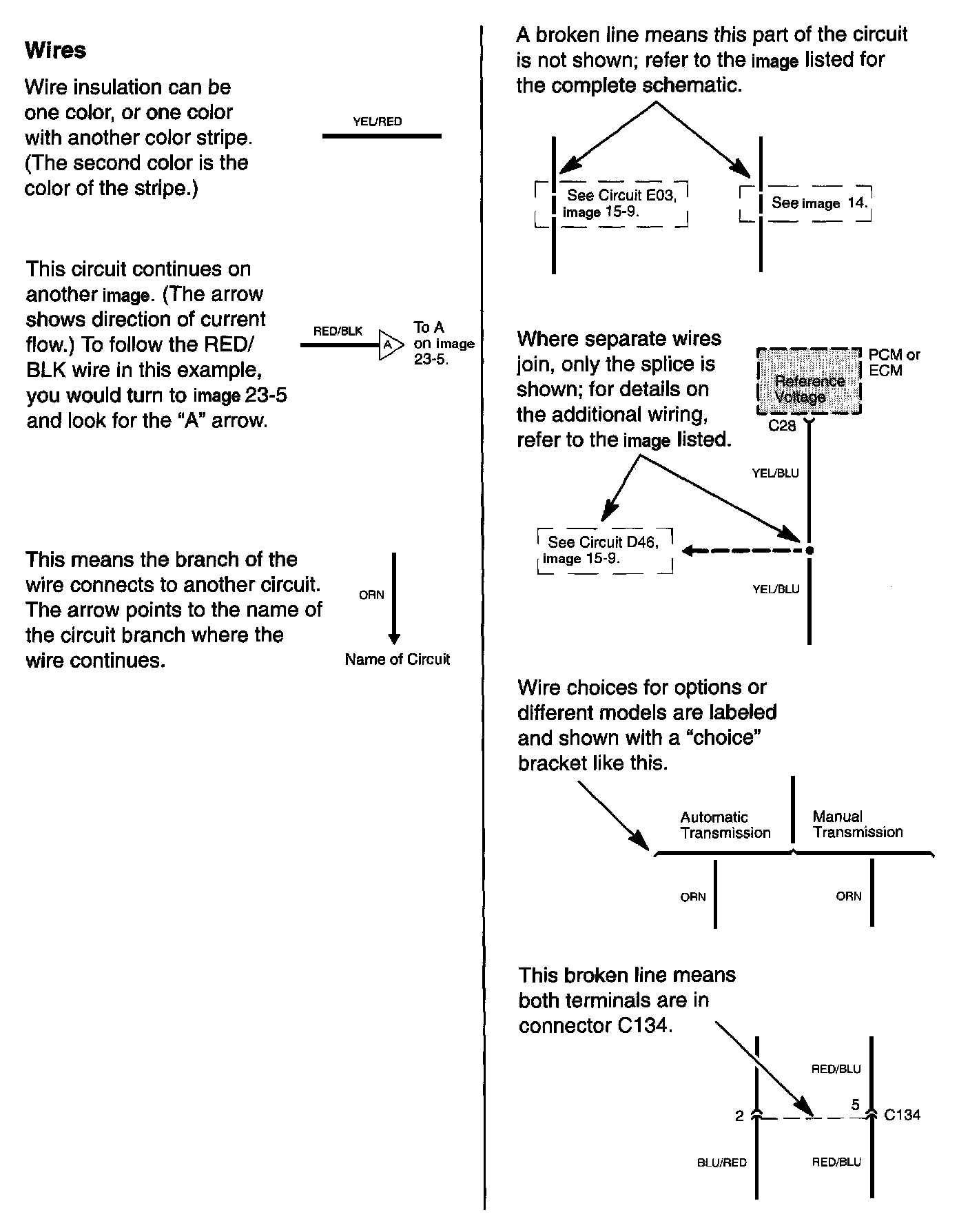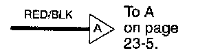 This circuit continues on another image. (The arrow shows direction of current flow.) To follow the RED/BLK wire in this example, you would turn to "Fuel and Emissions" and look for the "A" arrow.