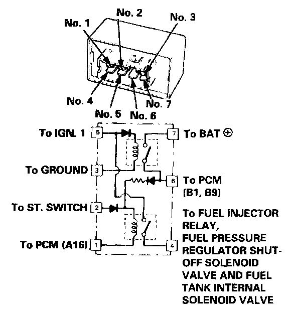 - If there is continuity, the PGM-FI main relay is OK. If the fuel injector relay, fuel pressure regulator shut-off solenoid valve and fuel tank internal solenoid valve still do not work, go to Harness Testing.