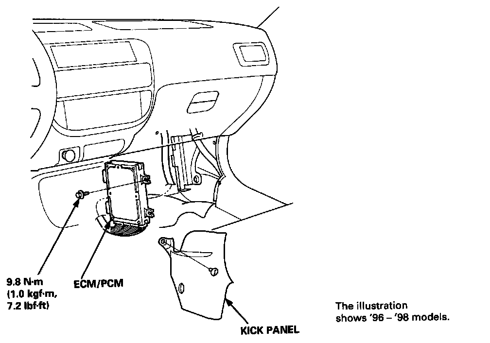 If the inspection for a particular code requires voltage or resistance checks at the ECM/PCM connectors, remove the right kick panel. Pull the carpet back to expose the ECM/PCM. Remove the ABS control unit if so equipped. Unbolt the ECM/PCM bolt. Turn the ignition switch OFF, and connect the backprobe sets and a digital multimeter as described below.