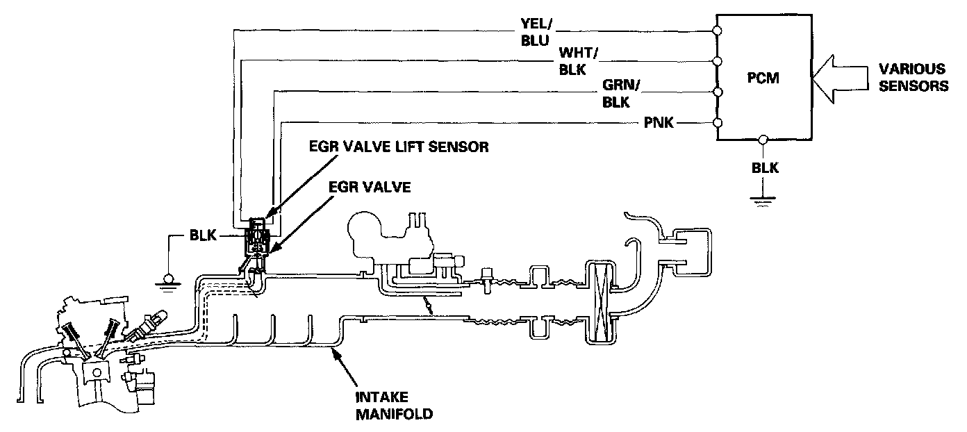 The EGR valve lift sensor detects the amount of EGR valve lift and sends it to the PCM. The PCM then compares it with the ideal lift in its memory (based on signals sent from other sensors). If there is any difference between the two, the PCM cuts current to the EGR valve.