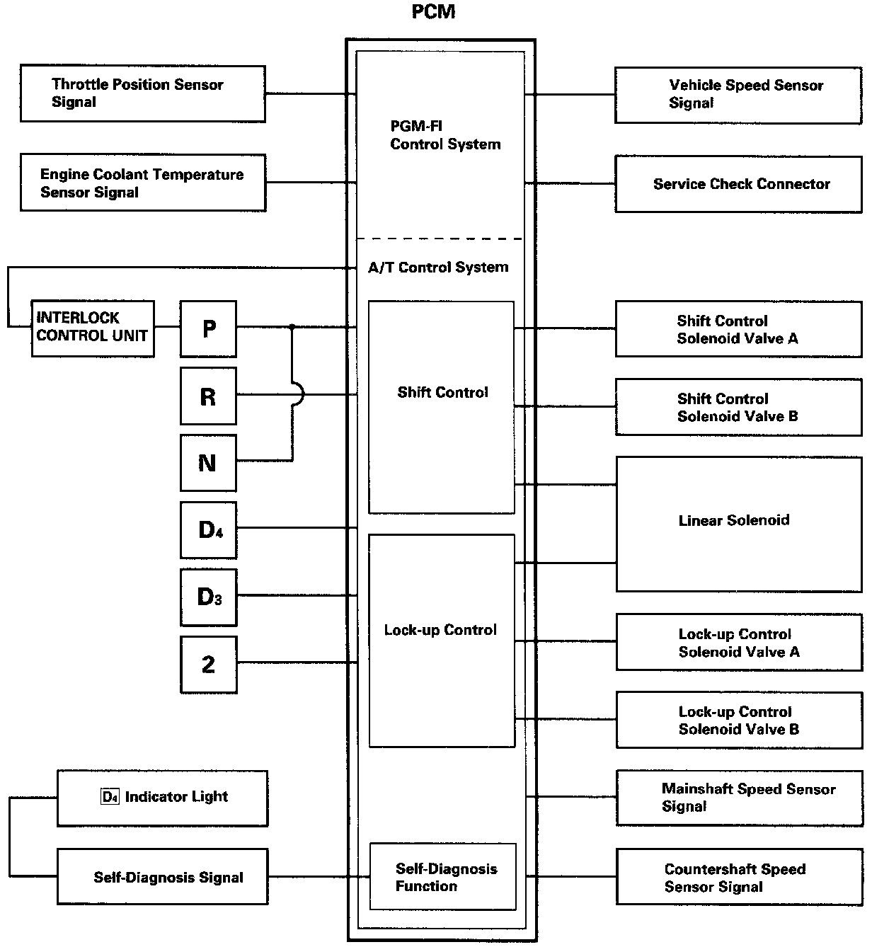 The electronic control system consists of a Powertrain Control Module (PCM), sensors, a linear solenoid and four solenoid valves. Shifting and lock-up are electronically controlled for comfortable driving under all conditions. The PCM is located below the dashboard, under the front lower panel on the passenger's side.