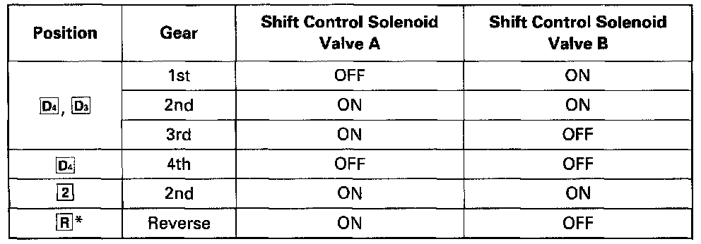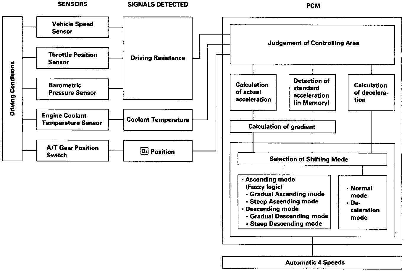 The PCM instantaneously determines which gear should be selected by various signals sent from sensors, and actuates the shift control_solenoid valves A and B to control shifting. Also, a Grade Logic Control System has been adopted to control shifting in D4 position while the vehicle is ascending or descending a slope, or reducing speed.