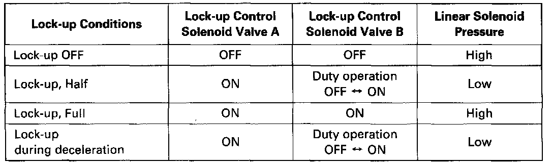 From sensor input signals, the PCM determines whether to turn the lock-up ON or OFF, and activates lock-up control solenoid valve A and/or B accordingly. The combination of driving signals to lock-up control solenoid valves A and B and the linear solenoid pressure is shown in the table below.