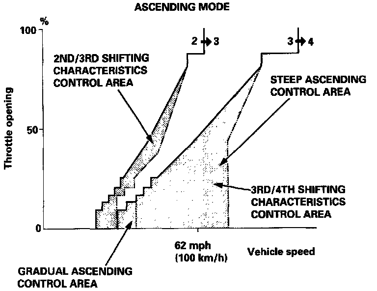 When the PCM determines that the vehicle is climbing a hill in position, the system extends the engagement area of 2nd gear and 3rd gear to prevent the transmission from frequently shifting between 2nd and 3rd gears, and between 3rd and 4th gears, so the vehicle can run smooth and have more power when needed. There are two ascending modes with different 3rd gear driving areas according to the magnitude of a gradient stored in the PCM.