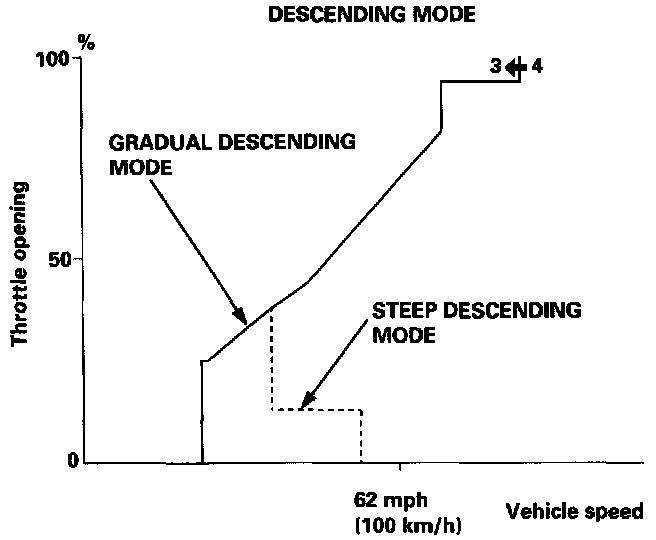 When the PCM determines that the vehicle is going down a hill in position, the shift-up speed from 3rd to 4th gear when the throttle is closed becomes faster than the set speed for flat road driving to widen the 3rd gear driving area. This, in combination with engine braking from the deceleration lock-up, achieves smooth driving when the vehicle is descending. There are two descending modes with different downshift (4 - 3) schedules according to the magnitude of a gradient stored in the PCM. When the vehicle is in 4th gear, and you are decelerating on a gradual hill, or when you are applying the brakes on a steep hill, the transmission will downshift to 3rd gear. When you accelerate, the transmission will then return to 4th gear.