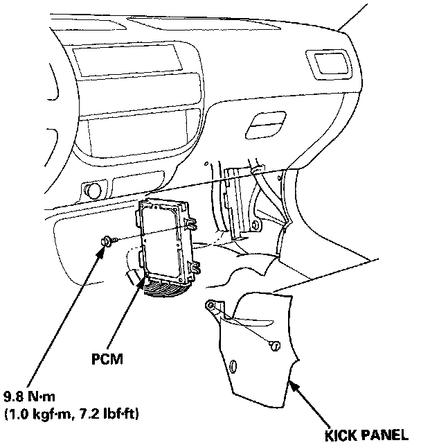 1. Remove the kick panel on the passenger's side.2. Remove the PCM, and turn the PCM over.