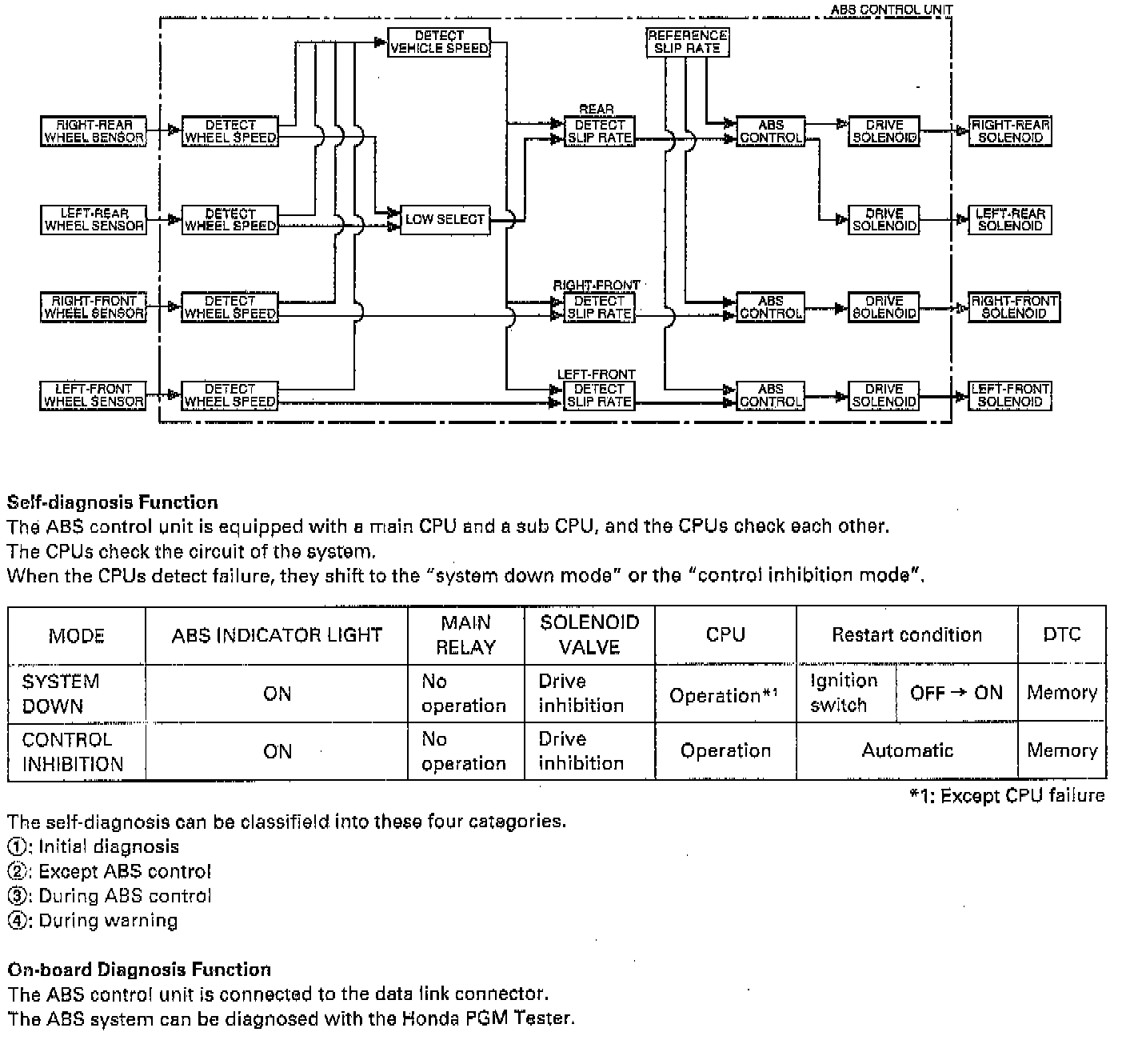 The ABS control unit detects the wheel speed based on the wheel sensor signal it received, then it calculates the vehicle speed based on the detected wheel speed. The control unit detects the vehicle speed during deceleration based on the rate of deceleration. The ABS control unit calculates the slip rate of each wheel, and it transmits the control signal to the modulator unit solenoid valve when the slip rate is high. The pressure reduction control is a three-mode system, that is pressure reduction, pressure retaining and pressure intensifying modes.