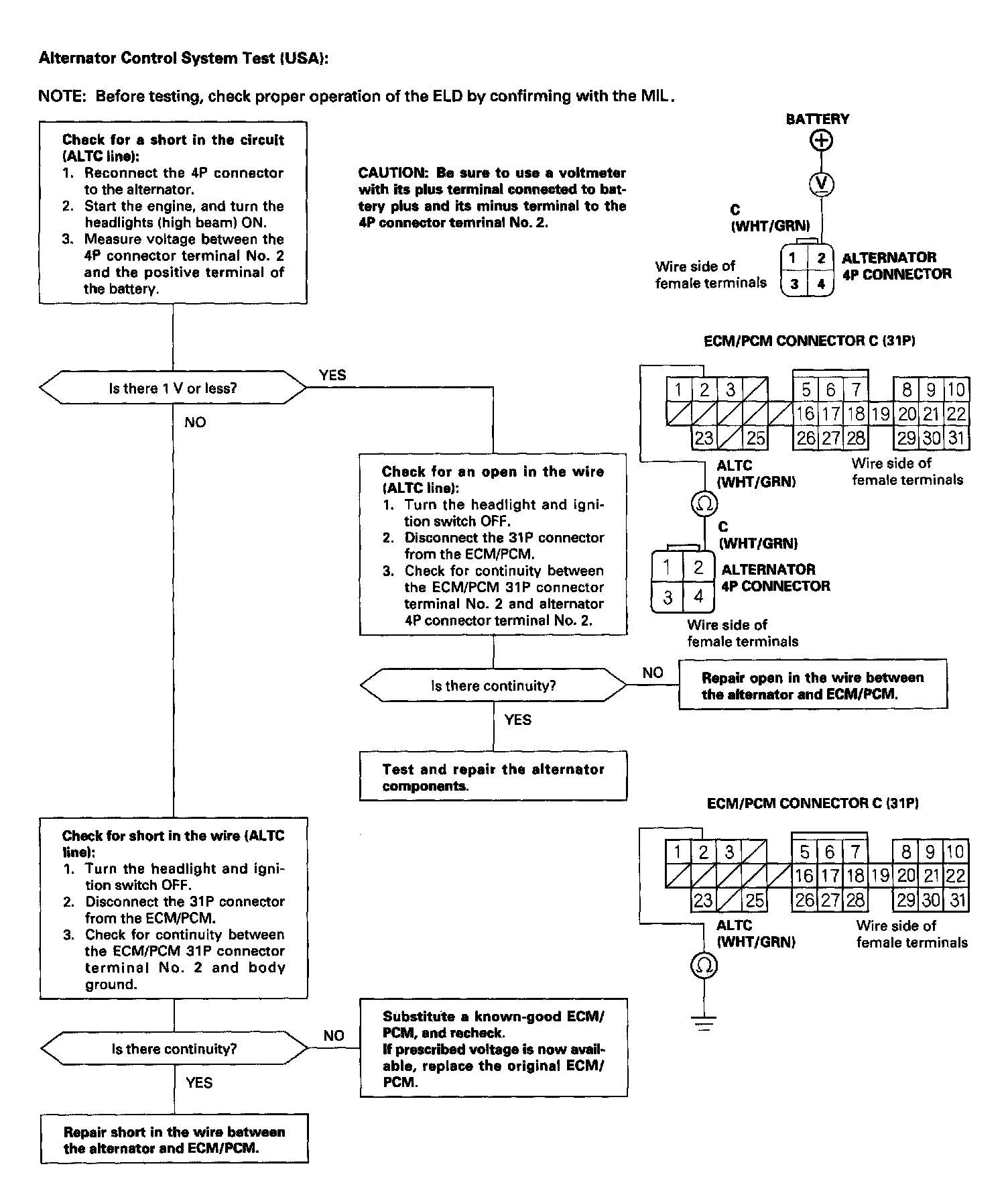 Alternator Control System Test (USA): '99-00 All Except SOHC VTEC-E (Manual Transmission):