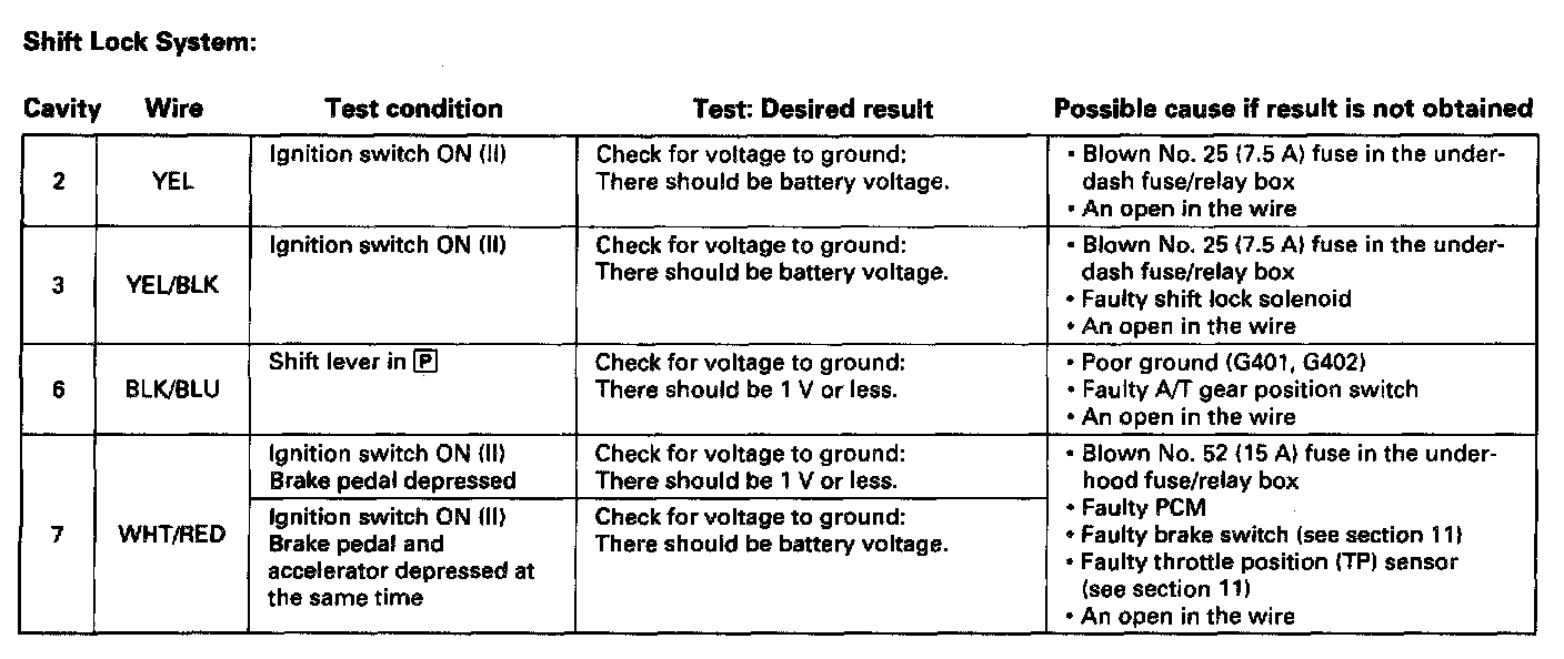 NOTE: If the shift lock solenoid clicks when the ignition switch is turned ON (II) and you step on the brake pedal (with the shift lever in [P]), the shift lock system is electronically normal; if the shift lever cannot be shifted from [P], test the A/T gear position switch, park pin switch.
