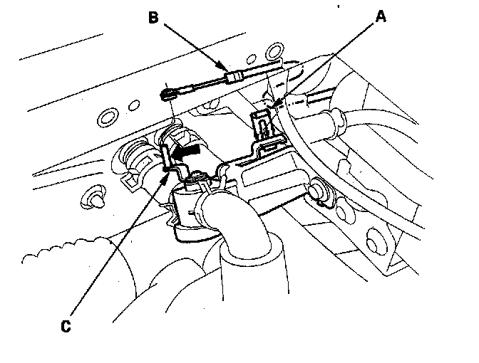 Heater Valve Cable Adjustment1. From under the hood, open the cable clamp (A), then disconnect the heater valve cable (B) from the heater valve arm (C).