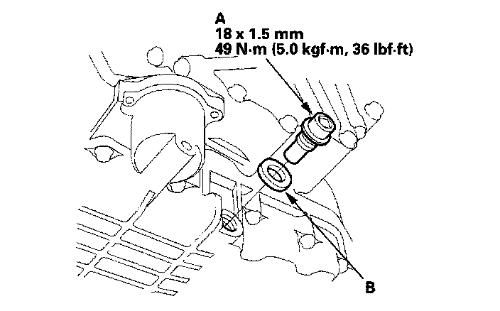 6. Remove the drain plug (A), and drain the automatic transmission fluid (ATF). Reinstall the drain plug with a new sealing washer (B).