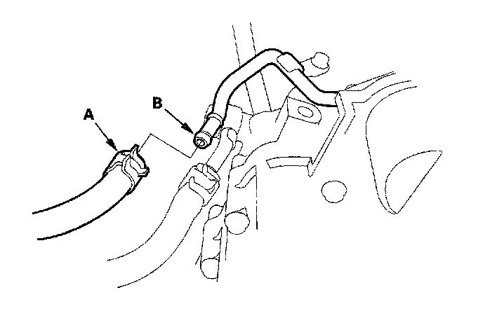 7. Remove the ATF cooler inlet hose (A) from the ATF cooler inlet line (B). Turn the end of the ATF cooler inlet hose up to prevent ATF from flowing out, and plug the ATF cooler hose and line.