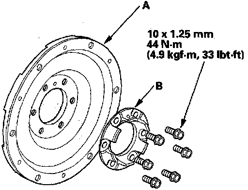 Drive Plate Removal and Installation1. Remove the drive plate (A) and washer (B) from the engine crankshaft.