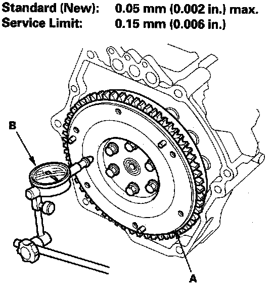 3. Measure the flywheel (A) runout using a dial indicator (B) through at least two full turns engine installed. Push against the flywheel each time you turn it to take up the crankshaft thrust washer clearance. If the runout is more than the service limit, replace the flywheel and recheck the runout. Resurfacing the flywheel is not recommended.