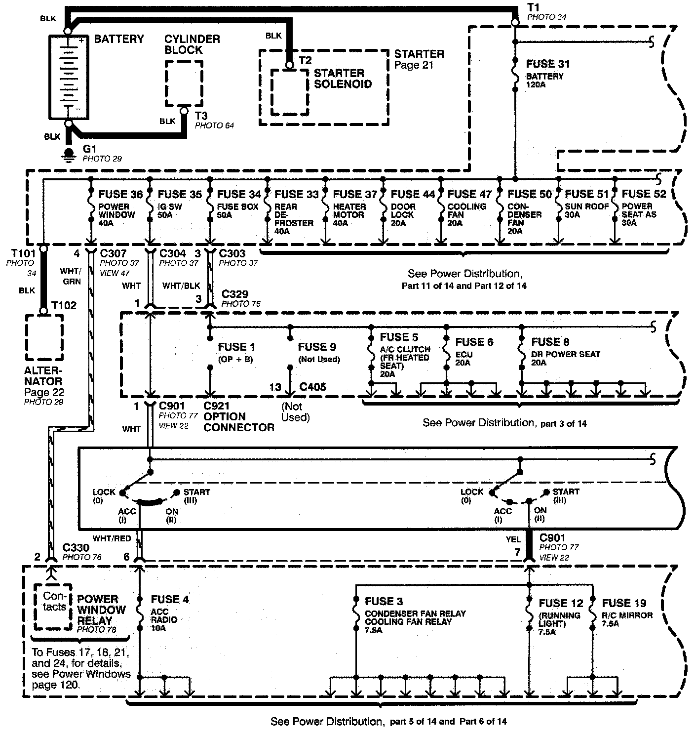 Power Distribution schematics show how power is supplied from the positive battery terminal to various circuits in the car. Refer to the Power Distribution section to get a more detailed picture of how power is supplied to the circuit you're working on.From Battery to Ignition Switch, Fuses and Relays