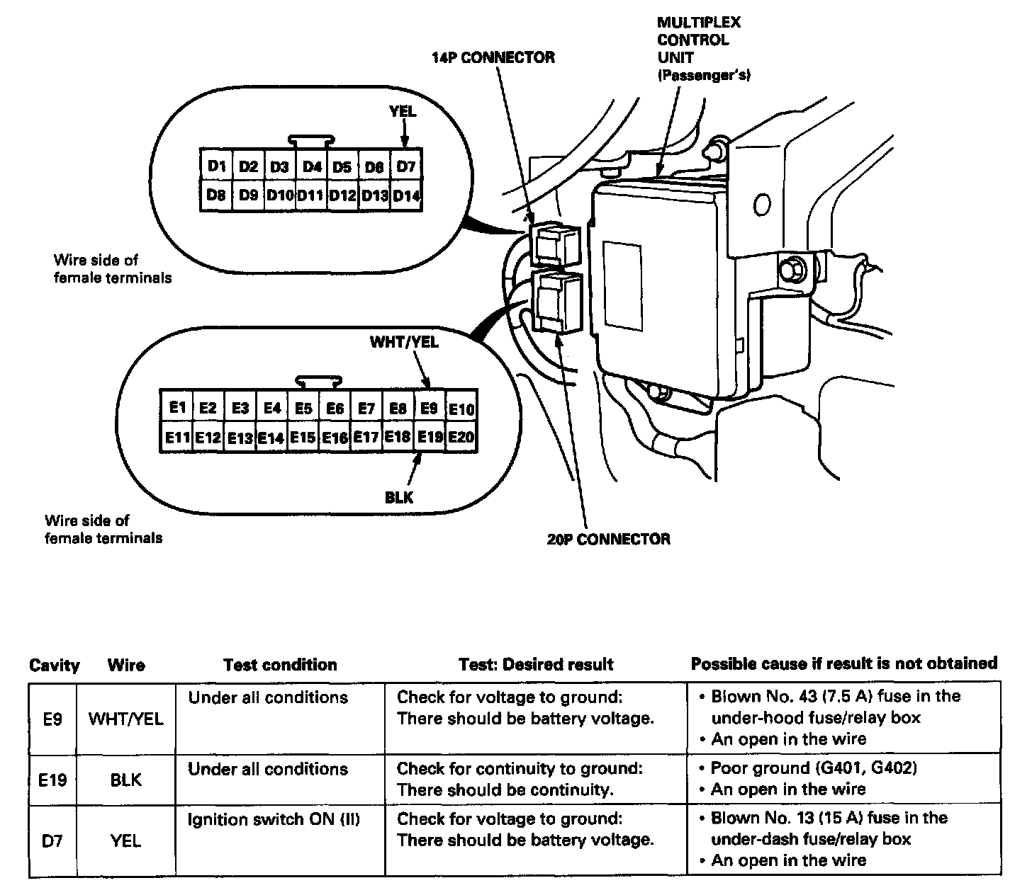 Multiplex Control Unit (Door):1. Remove the driver's door panel, and disconnect the 2OP connector from the door unit.