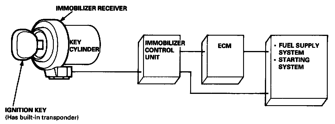 The vehicle is equipped with an immobilizer system that will disable the vehicle unless the proper ignition key is used. This system consists of a transponder located in the ignition key, a receiver, a control unit, an indicator light, and the ECM.The vehicle has three kinds of keys.