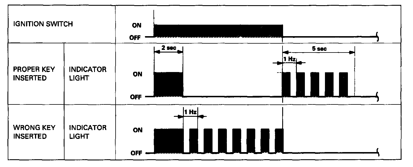 ^ If the wrong key has been used and the code was not received or recognized by the unit, the indicator light will come on for about two seconds, then it will continue blinking until the ignition switch is turned OFF.