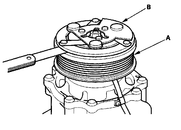 3. Measure the clearance between the rotor pulley (A) and the armature plate (B) all the way around. If the clearance is not within specified limits, remove the armature plate and add or remove shims as needed to increase or decrease clearance.